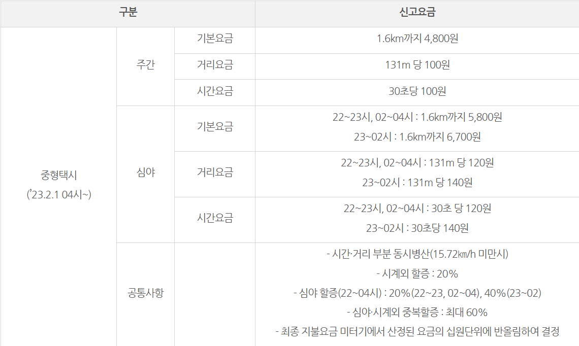 - 중형택시는 외국인 할증(20%), 심야 할증(20~40%), 시계 외 할증(20%)을 동시에 적용하더라도 최대 60%까지만 할증 가능