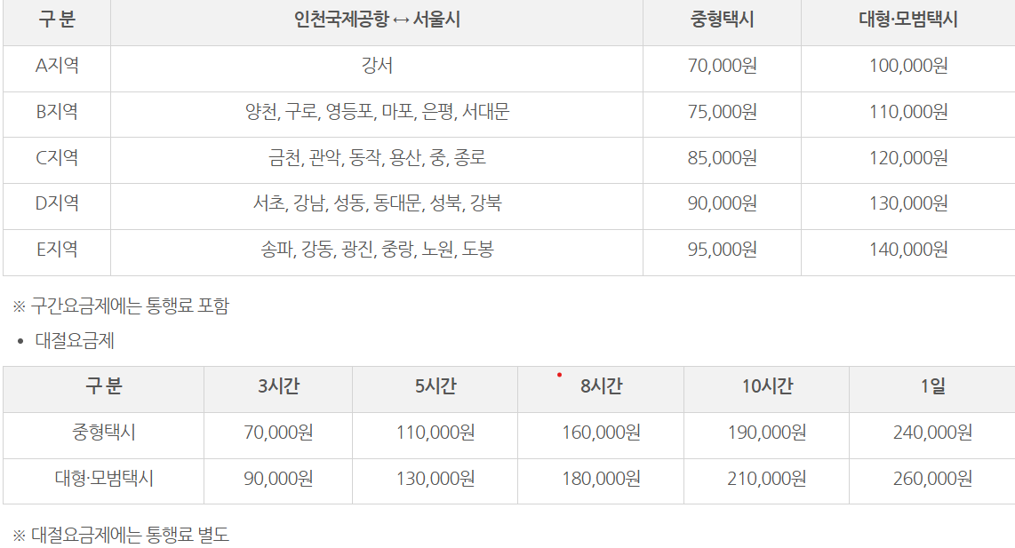 ※ 인천국제공항의 경우 인천국제공항을 공동사업구역으로 하는 서울시, 경기도(광명시, 부천시, 김포시, 고양시), 인천시까지는 시계 외 할증 미적용, 6개 시도경계부터 적용 (02-2133-2317로 문의)