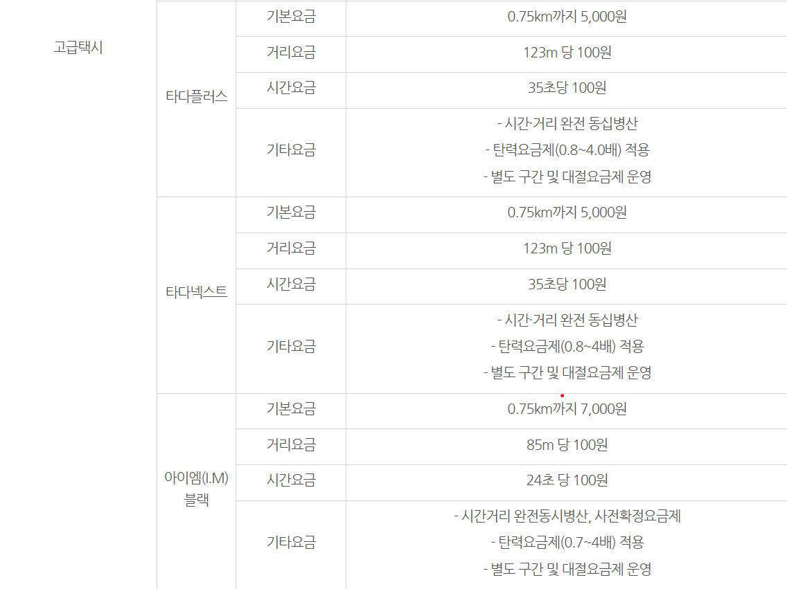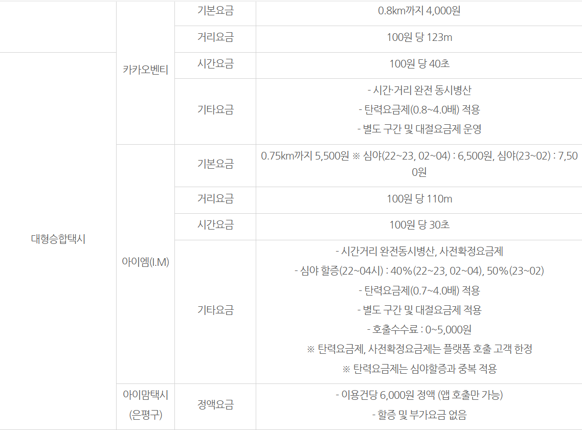 * 고급택시, 대형승합택시 서비스 유형별 기타 요금 세부사항 문의(02-2133-2317)
