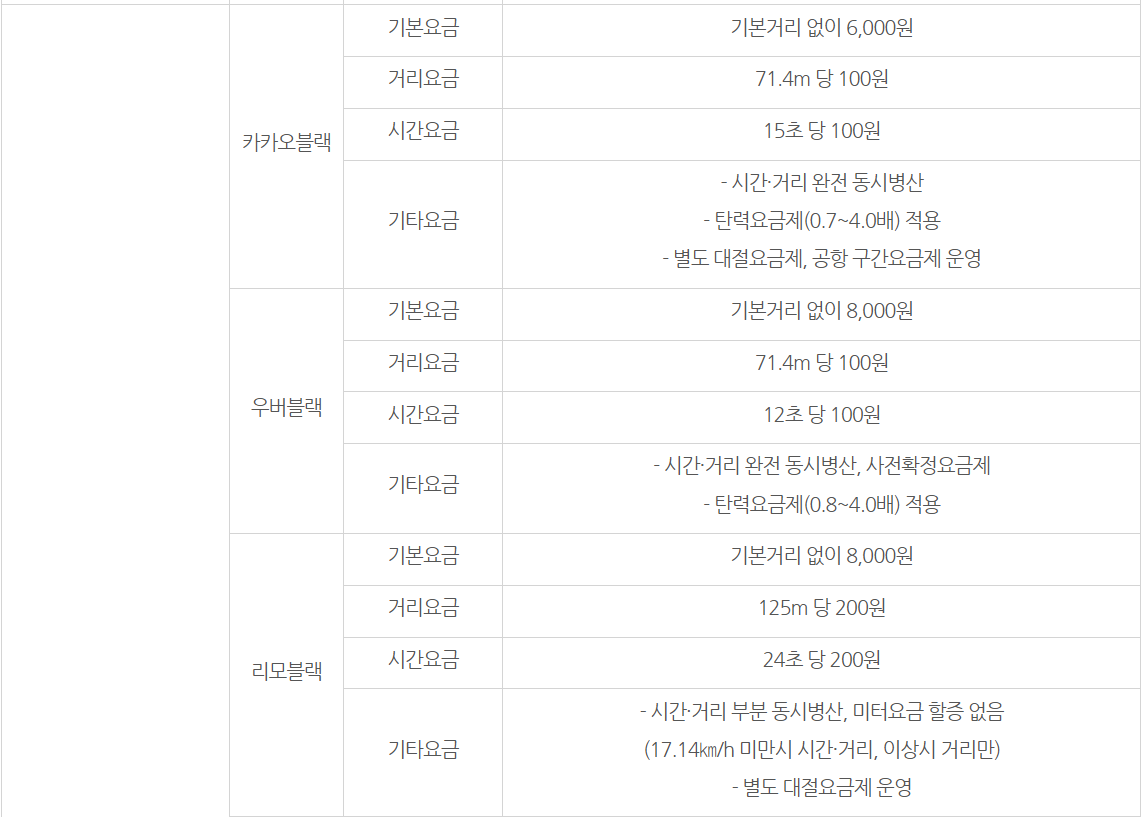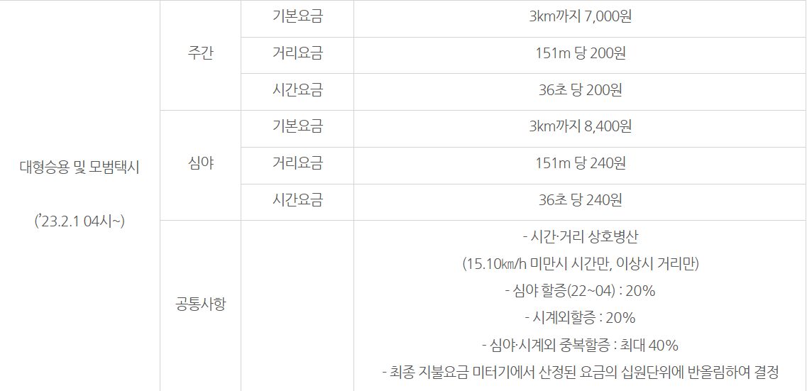 미터요금제 : 중형, 대형승용, 모범택시와 요금제와 동일